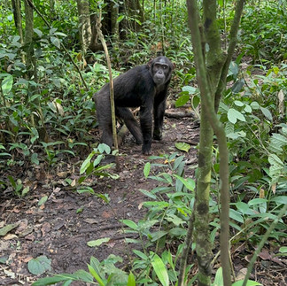 Uganda je nádherná země, ale hlavním cílem mé návštěvy je sledování šimpanzů a goril v jejich přirozeném prostředí. Začínám se šimpanzi v národním parku Kibali na hranicích s Demokratickou republikou Kongo. V sedm ráno máme krátké školení o správném chování v přítomnosti šimpanzů. Jakmile je najdeme, můžeme s nimi strávit maximálně hodinu. Musíme si udržovat odstup alespoň deset metrů. Pokud se k nám šimpanzi přiblíží, nemáme se jich dotýkat. Po celou dobu musíme mít nasazené roušky, protože s nimi sdílíme 99,97 % DNA a mohli bychom si snadno předat nemoci. Je zakázáno napodobovat jejich řeč. "To se naučila jen Jane Goodall a trvalo jí to celý život. Neočekávejte, že se to naučíte za hodinu," vtipkuje ranger. Naše osmičlenná skupina, což je maximální počet povolených lidí, následuje mladou ozbrojenou rangerku. I její dva pomocníci mají pušky, aby nás chránili před případným střetem se slony. Vysílačka rangerky zachrastí a nasazuje ostré tempo přes neprostupný porost. Žádné vyšlapané stezky tu nejsou, prodíráme se větvemi jeden po druhém. Po chvíli rangerka ukazuje na korunu stromu nad námi, kde sedí tlupa šimpanzů. Několik z nich se dává do pohybu a nad našimi hlavami začíná drama jako z Planety opic.